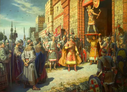 Византийцы целовали крест в знак верности заключенному соглашению. Олег, согласно русскому обычаю, дал клятву на верность договору своим оружием, богом Перуном и скотьим богом Волосом. В конце церемонии, в знак победы, Олег повесил свой боевой щит на ворота Константинополя.