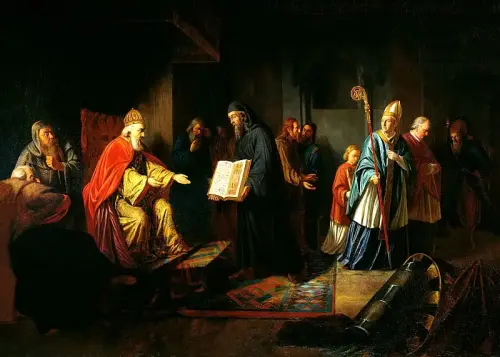 Прислали своего посла и греки. Греческий проповедник рассказал Владимиру о православной вере. Но князь Владимир сказал: «Немного подожду», и отправил своих послов в Византию в Царьград.