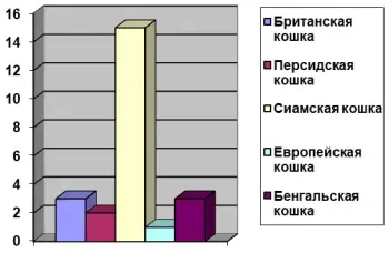 Вывод: опрос показал, что большинство учащихся 1 класса (24 человек), хотели бы завести сиамскую кошку. Британскую кошку хотят завести 3 человека. Столько же учеников (3 человека) хотят приобрести бенгальскую кошку. Два человека хотят завести персидскую кошку. А 1 ученик хотели бы завести кошку европейской породы.