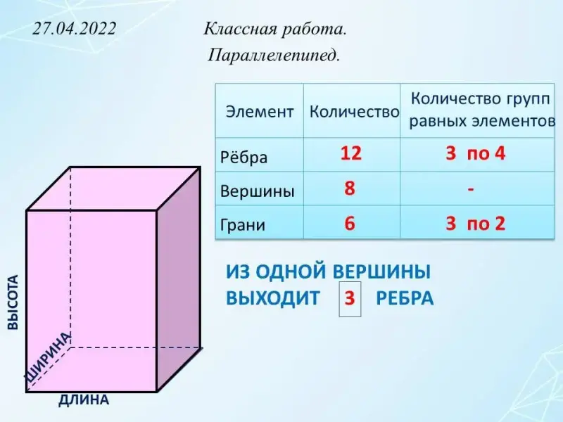 - Определять взаимное расположение граней, рёбер, вершин параллелепипеда.
