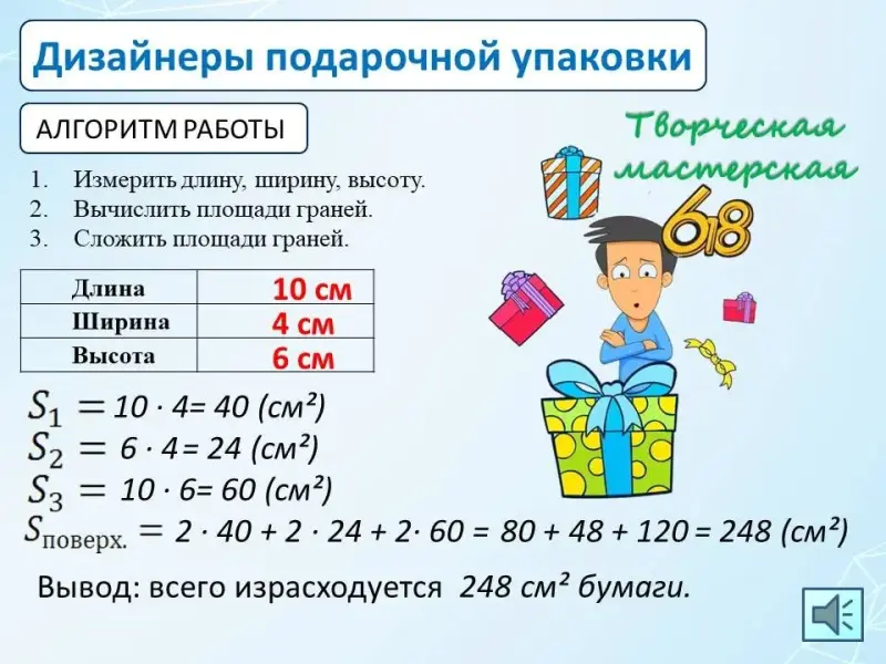 - Сколько бумаги (в см²) необходимо нам приготовить, чтобы оклеить всю внешнюю поверхность подарочной коробки, если каждую грань мы будем обклеивать отдельно (без загибов)? (необходимо измерить длину, ширину, высоту; найти площади граней и сложить)