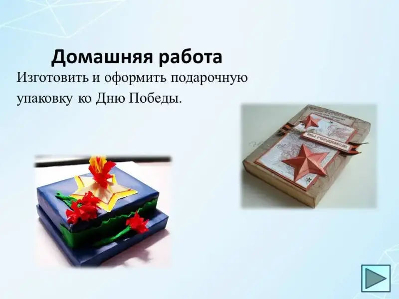 - В преддверии праздника 9 мая предлагаю вам следующее творческое задание: Изготовить и оформить подарочную упаковку ко Дню Победы!