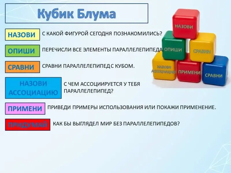 Оборудование: ноутбук, колонки для музыкального фона, рабочие листы, подарочная коробка с наполнением (конструктор Лего, книга, коробочка от телефона и т.п.), наборы конструктора 3D OZUGA СОЕДИНИ-ПОСТРОЙ, коробочка для творчества с наполнением (заготовленные параллелепипеды, конверты с самокляющейся бумагой по размеру параллелепипедов, маленькие подарочные самоклеящиеся бантики), ваза в форме параллелепипеда, кубики трёх цветов для каждого ученика (зелёный, жёлтый, красный), каркасный параллелепипед, Кубик Блума.