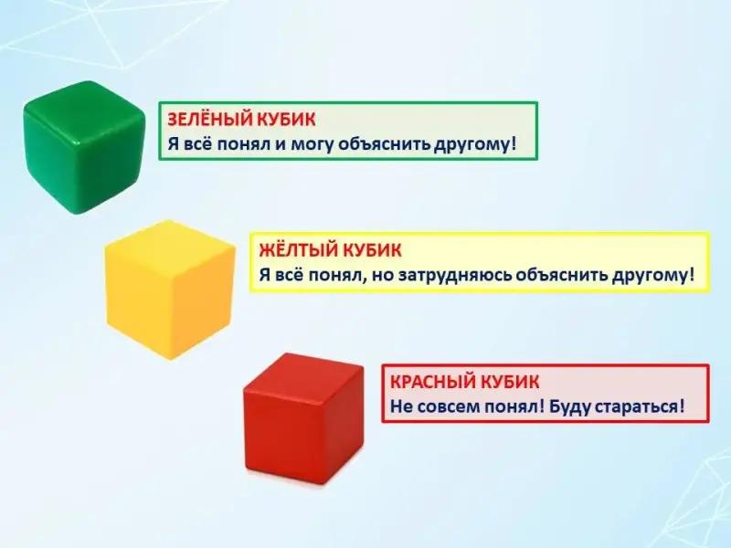 - Возьмите кубик определенного цвета: зелёный - если вы считаете, что хорошо усвоили материал, разобрались в изученной теме, Жёлтый - если осталось что-то неясно. А если совсем не разобрались, то возьмите красный кубик.