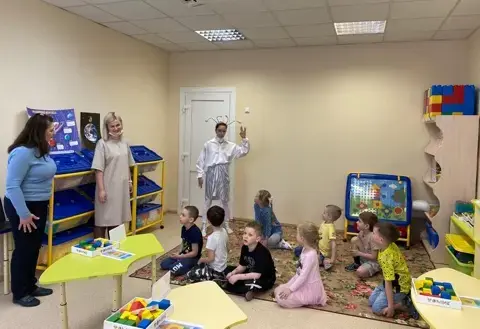 Космо: Ребята, привет! Я - космическая странница, а зовут меня - Космо! Я каким-то непонятным, странным образом попала на вашу планету. Вообще-то я хотела попасть в межгалактическое пространство, потому что где-то там потерялась моя лучшая подружка звезда Лира, но думаю что-то пошло не так и я попала к вам. Ребята, но мне срочно нужно вернуться обратно в моё безвоздушное космическое пространство и найти свою подругу. Вы мне готовы помочь? (ответы детей)