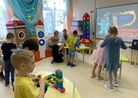 Анна: Ребята, как здорово, вы победили всех космических пиратов! Но вдруг все-таки кто-то, или что-то помешает нашему полету и наши ракеты выйдут из строя. Чтобы этого не произошло, предлагаю вам построить по запасной ракете. Обратите внимание на доску, на ней изображен образец ракеты, которая должна у вас получиться. Детали конструктора перед вами, поэтому предлагаю не затягивать и начинать!