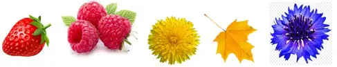 - В какой цвет природа окрасила клубнику? Малину? Одуванчик и кленовый лист? В какое время года лист клёна окрашен в желтый цвет? А какого цвета василёк?