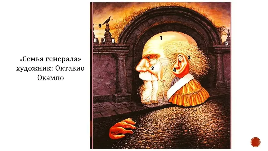 Следующее не менее интересное задание, на слайде представлена картина «Семья генерала» мексиканского художника Октавио Окампо, вам необходимо найти на этой картине как можно больше лиц, на выполнение 1 минута, время пошло. (Внимание, восприятие)