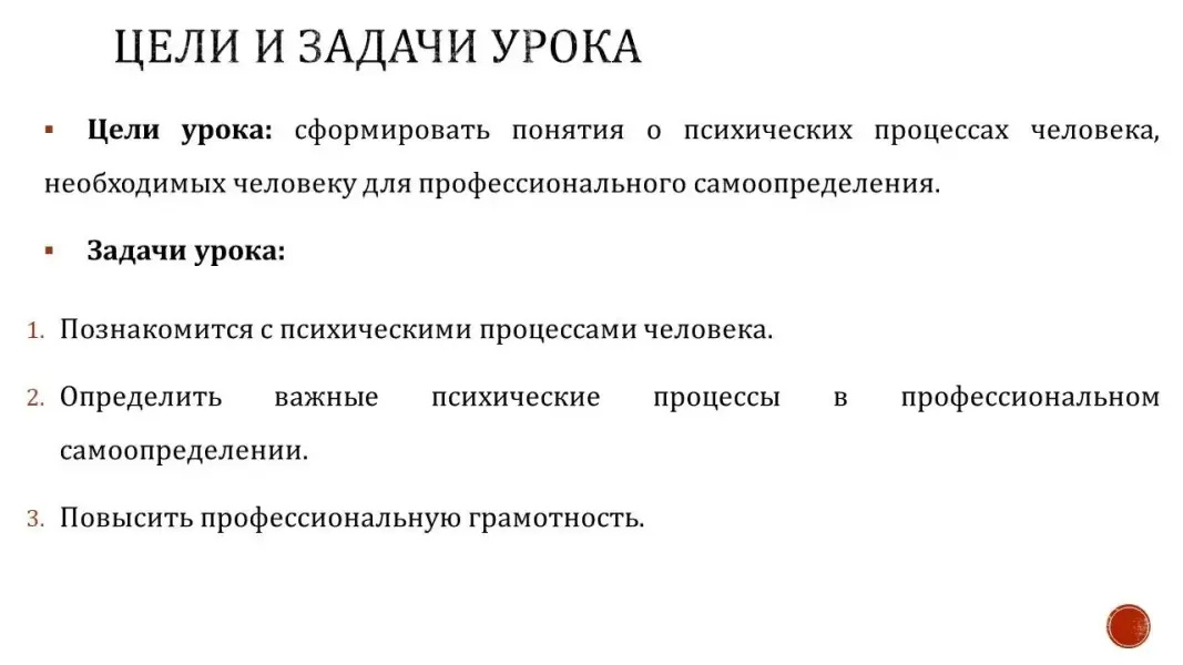 Цели урока: сформировать понятия о психических процессах человека, необходимых человеку для профессионального самоопределения.