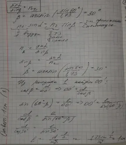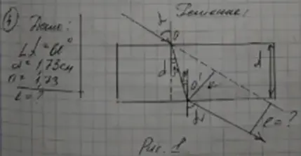 А4. Угол падения луча на поверхность плоскопараллельной пластинки равен 60°. Толщина пластинки 1,73 см, показатель преломления 1,73. На сколько смещается вышедший из пластинки