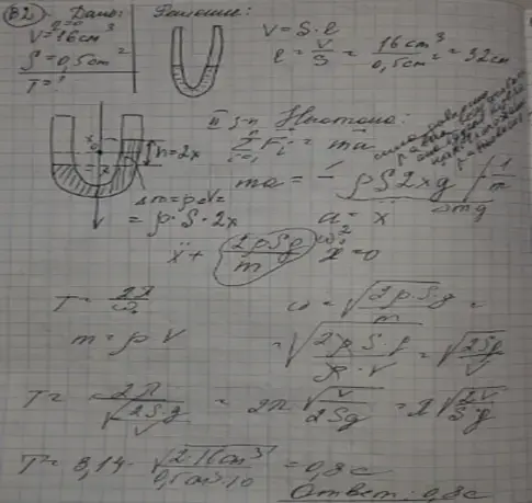В2. Жидкость объемом 16 см3 быстро вливают в U-образную трубку с площадью сечения 0,5 см2. Пренебрегая вязкостью, найдите период малых колебаний жидкости.