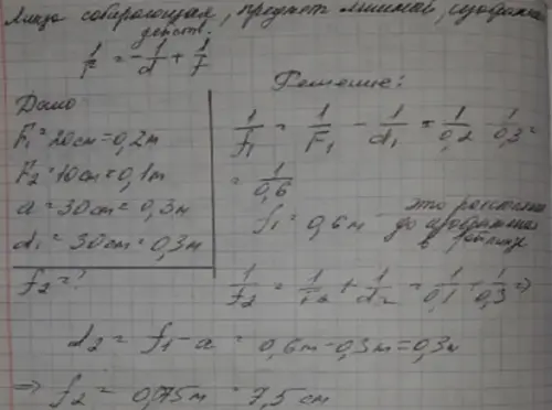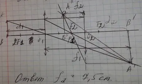 В4. Имеются две собирающие линзы с фокусными расстояниями 20 и 10 см. Расстояние между линзами равно 30 см. Предмет находится на расстоянии 30 см от первой линзы. На каком расстоянии от второй линзы получится изображение?