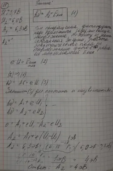 C1. На платиновую пластину падают ультрафиолетовые лучи. Для запирания фототока нужно приложить задерживающую разность потенциалов U1 = 3,7 В. Если вместо платиновой поставить пластину из другого металла, то задерживающую разность потенциалов нужно будет увеличить до U2 = 6,0 В. Определите работу выхода электронов с поверхности пластины из неизвестного металла, если работа выхода электронов из платины равна 6,3 эВ.