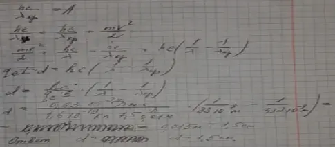 С2. Плоский алюминиевый электрод освещается ультрафиолетовым светом с длиной волны 83 нм. На какое максимальное расстояние от поверхности электрода может удалиться фотоэлектрон, если вне электрода имеется задерживающее электрическое поле напряженностью 7,5 В/см? (Красная граница фотоэффекта для алюминия соответствует длине волны 332 нм.)