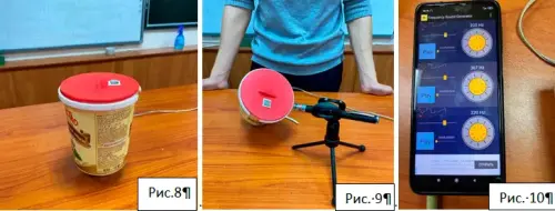 Для наблюдения фигур Лиссажу с помощью лазерной указки я изготовил установку (Рис.8) из пластикового ведерка из-под майонеза. В донышке ведерка я закрепил динамик от звуковой колонки (вырезаем дно и на шурупах закрепляем динамик). На ведерко я натянул мембрану, в качестве которой был использован воздушный шарик (можно использовать резиновую перчатку). При помощи двухстороннего скотча на мембране я закрепил легкое плоское зеркальце примерно между центром и краем ведерка. Чтобы установка никуда не «убежала» от вибраций, нужно ее поставить на мягкую ткань. Лазер закрепляем на штативе резинкой (Рис. 9). Луч лазера направляем на зеркало, чтобы он отразился и попал на экран. На смартфон я загрузил программу звукового генератора (Рис. 10), вырабатывающего сигнал на трех частотах. С помощью приложения звуковой генератор настраивал на определенную частоту и выводил на динамик.