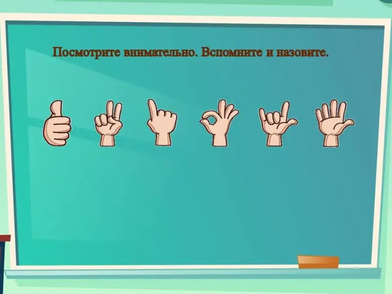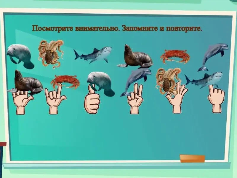 В) С опорой на изображение позы кисти руки (Слайд 16 появляется по щелчку мыши) двумя руками повторите движения, указанные на слайде одновременно вспоминайте и называйте какому морскому животному соответствует этот жест (выполняем слева направо и обратно)