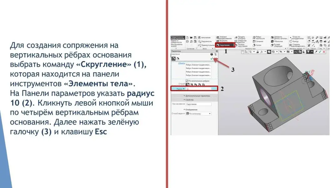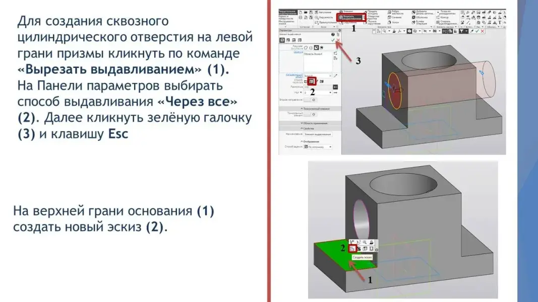 Учитель - Прежде чем создавать трёхмерную модель детали, необходимо её проанализировать, так как построение модели заключается в последовательном выполнении операций объединения, вычитания и пересечения над простыми объёмными элементами (призмами, цилиндрами, пирамидами, конусами и т.д.)