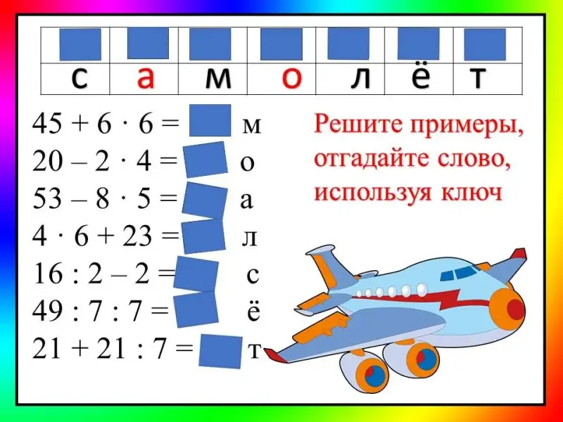 - Поиск нового словарного слова, основанный на математических знаниях, путем решения примеров.