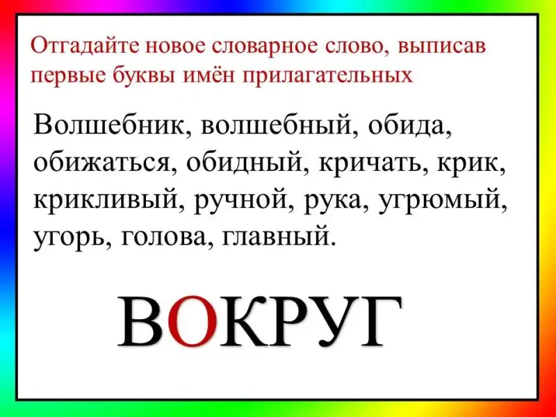 Отгадайте новое словарное слово, выписав первые буквы имён прилагательных Волшебник, волшебный, обида, обижаться, обидный, кричать, крик, крикливый, ручной, рука, угрюмый, угорь, голова, главный. |
