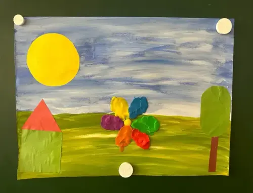 Посмотрите внимательно на аппликацию, на своем листе я сделала дом из геометрических фигур, посадила дерево.