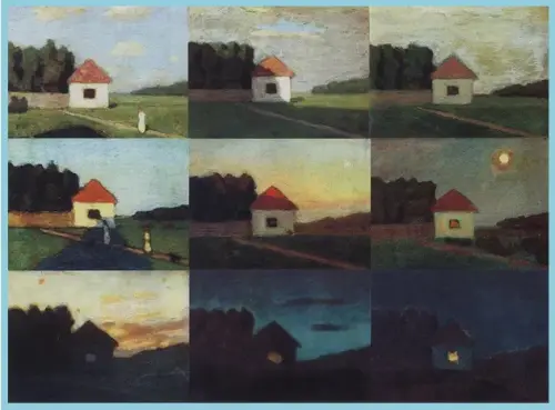 Н. - От времени суток, от погоды, от освещения, от многого другого. Чтобы обобщить свой опыт в 1934 году Николай Крымов для своих студентов пишет учебный пейзаж таблицу «Изменения в пейзаже по тону и цвету в разное время суток». Небольшой пейзаж. Белый дом с красной крышей, рядом с ним поляна, вдали лес. И всё это повторяется в ясный день, в пасмурный день, на закате, поздним вечером, в лунную ночь. Всего 9 раз. Для учеников Крымова было открытием, что окно, написанное коричневым цветом на тёмном фоне картины, будет светиться.