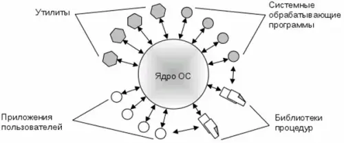 - все компоненты ОС разделяются на модули, выполняющие основные функции ОС (ядро), и модули, выполняющие вспомогательные функции ОС;
