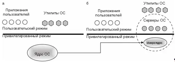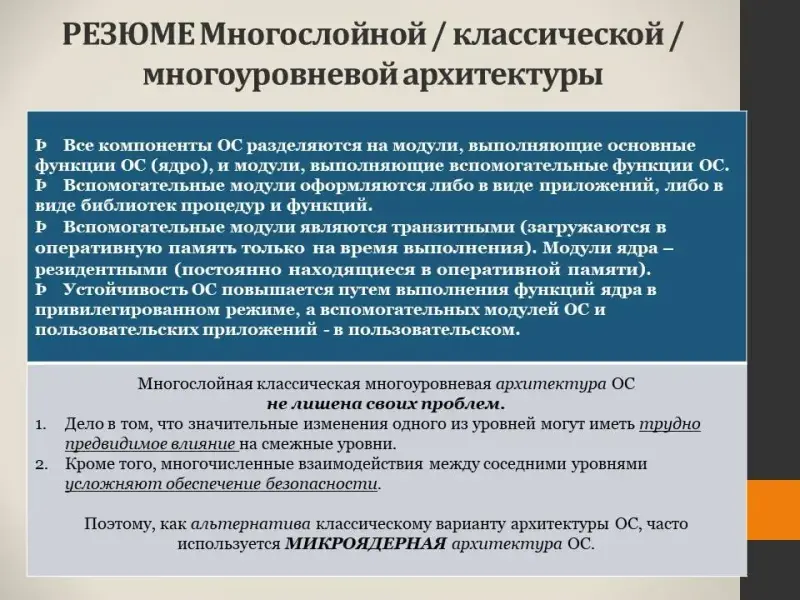 Многослойная классическая многоуровневая архитектура ОС не лишена своих проблем. Дело в том, что значительные изменения одного из уровней могут иметь трудно предвидимое влияние на смежные уровни. Кроме того, многочисленные взаимодействия между соседними уровнями усложняют обеспечение безопасности. Поэтому, как альтернатива классическому варианту архитектуры ОС, часто используется микроядерная архитектура ОС.