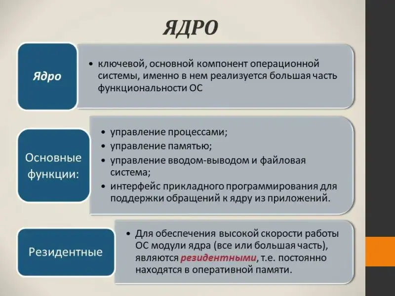 Ядро = ключевой, основной компонент операционной системы, именно в нем реализуется большая часть функциональности ОС, включает модули, выполняющие основные функции ОС: