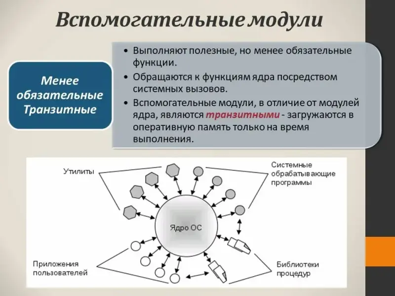 - вспомогательные модули являются транзитными. Модули ядра - резидентными;