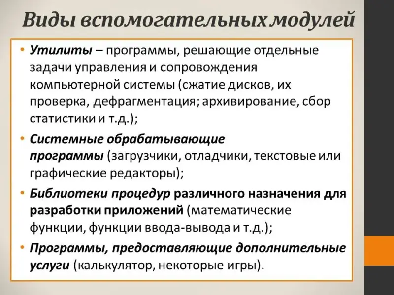 Обычно вспомогательные модули подразделяются на следующие группы: