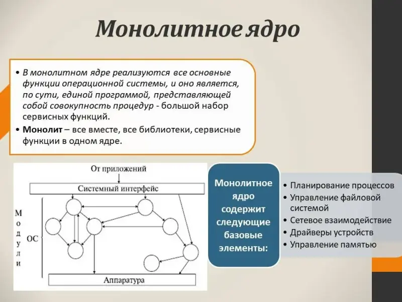 В монолитном ядре реализуются все основные функции операционной системы, и оно является, по сути, единой программой, представляющей собой совокупность процедур. В микроядре остается лишь минимум функций, который должен быть реализован в привилегированном режиме: планирование потоков, обработка прерываний, межпроцессное взаимодействие. Остальные функции операционной системы по управлению приложениями, памятью, безопасностью и пр. реализуются в виде отдельных модулей в пользовательском режиме.