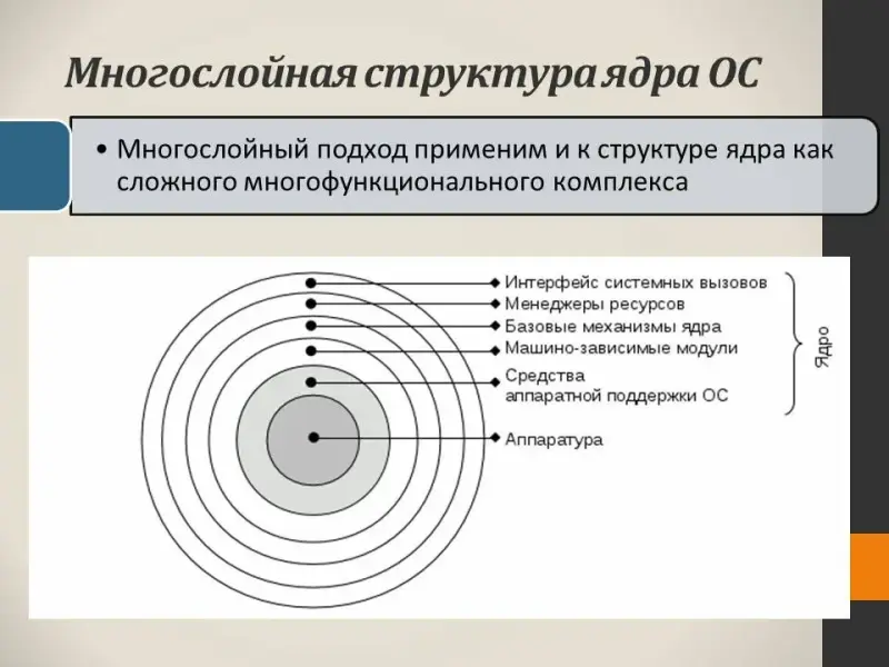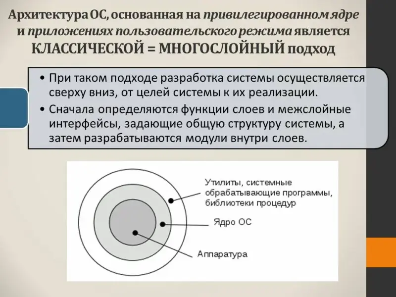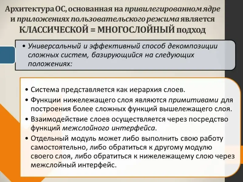 Многослойный подход = Архитектура ОС, основанная на привилегированном ядре и приложениях пользовательского режима, по существу, является классической.