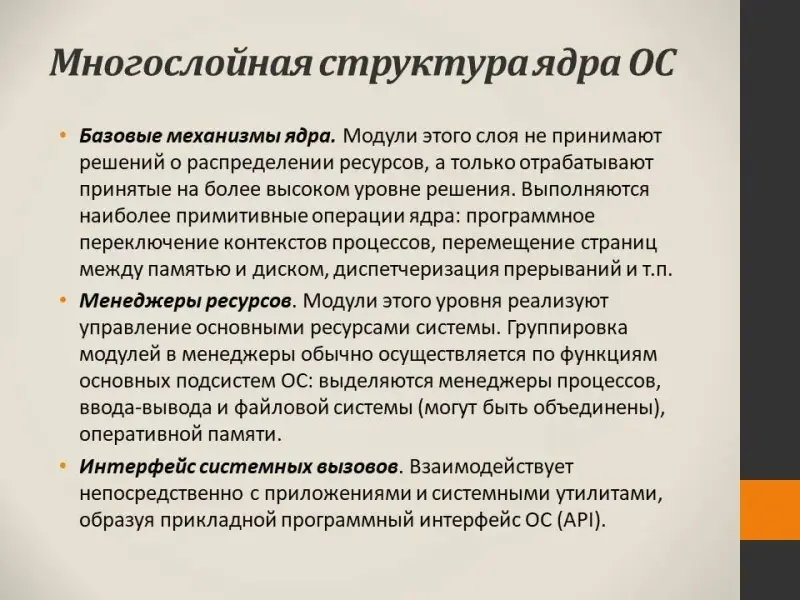 Базовые механизмы ядра. Модули этого слоя не принимают решений о распределении ресурсов, а только отрабатывают принятые на более высоком уровне решения. Выполняются наиболее примитивные операции ядра: программное переключение контекстов процессов, перемещение страниц между памятью и диском, диспетчеризация прерываний и т.п.