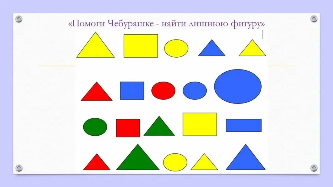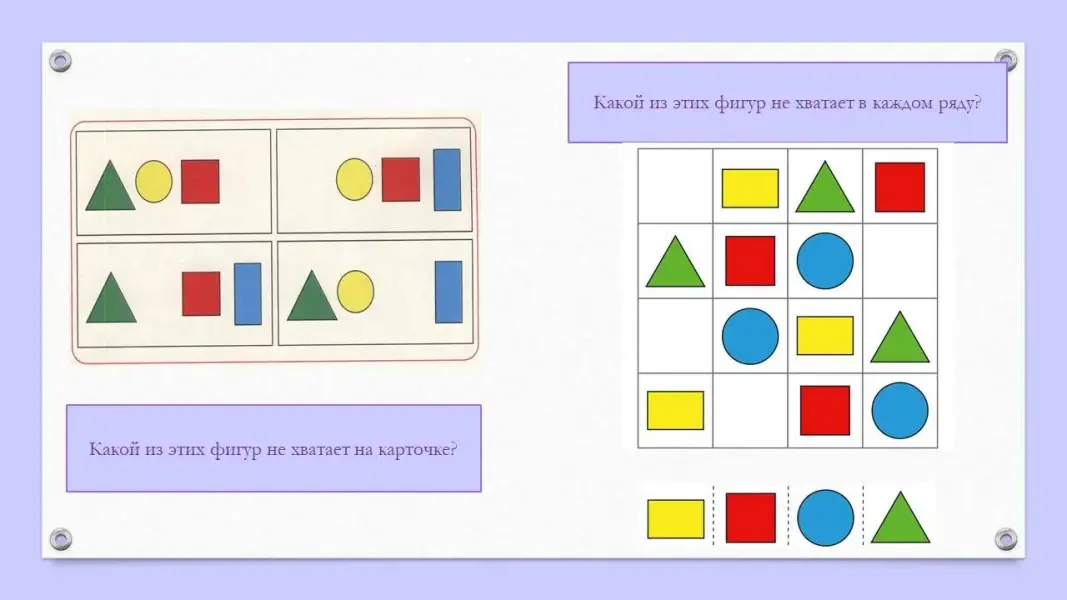 - логические игры и задачи (на поиск закономерности, недостающей фигуры, нахождение лишней фигуры, классификацию, словесные);