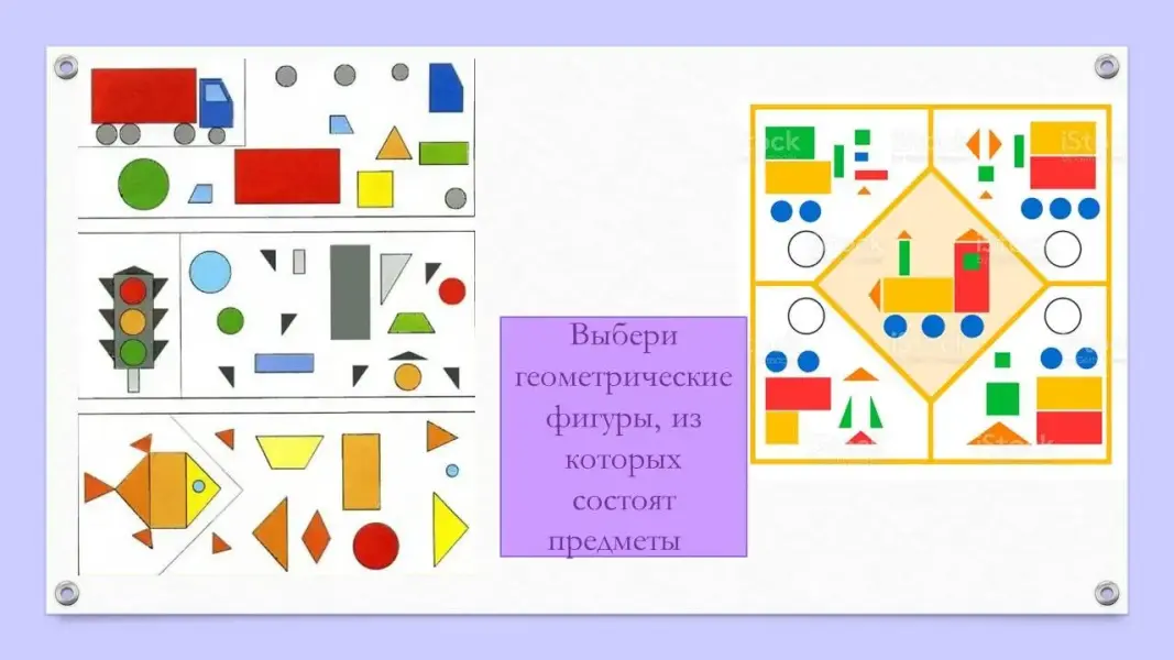 Знакомить детей с миром геометрических фигур можно так же с помощью развивающих игр, использовать которые можно как в организованной образовательной деятельности детей, так и в свободное время. К таким играм относятся: «Формы», «Геометрическая мозаика», «Волшебные фигуры. Эти игры направлены на развитие пространственного воображения детей. Они развивают зрительное восприятие, произвольное внимание, память и образное мышление, а также закрепляют название цветов и геометрических фигур. Знакомя с геометрическими фигурами, используем словесную игру «Пара слов». Мы говорим «Круг». Дети называют предмет, похожий на руль или колесо.