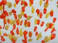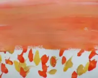 Приёмы размазывания учитель делает на формате А4-А3, у детей формат А-5. Грунтовка листа белой краской. Берём краски трёх цветов, ставим точки. Большой кистью щетина проводим горизонтальные линии один раз по одному месту, заходим за край листа. Размазывание фона руками (происходит раскрепощение ребёнка). |