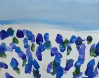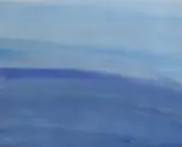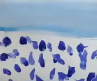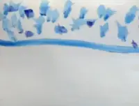 Грунтуем лист формата А4 белой гуашью большой кистью (щетина №14-16) в любом направлении. Это вы уже знаете. Берём среднюю кисть (щетина №8-12) и гуашью синего (голубого) цвета проводим прямую горизонтальную линию чуть выше середины листа. Ставим произвольно точки средней кисточкой (щетина №8-12) гуашью синего (голубого) цвета в верхней части листа. Если есть другой синий цвет, можно взять его. Фон будет только красивее. Берём большую кисть (щетина №14-16) для размазывания фона, окунаем в банку с белой краской и размазываем справа налево один раз по одному месту. Делаем это быстро, чтобы краска не успела высохнуть. Это вы уже знаете и умеете. |