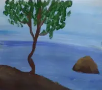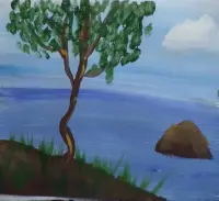 Будем рисовать листву. Но каждый лист прорисовывать не будем. Берём среднюю кисть (щетина №8-12). Окунаем её в гуашь зелёного цвета и пристукивающими движениями украшаем дерево листвой. Делаем это аккуратно, чтобы было видно воздушное пространство. Зелень не должна быть видна одним большим пятном. Должно быть видно небо. |