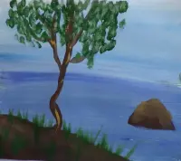 Также поступаем и с землёй на берегу. Поставим несколько точек цвета охра и краску растираем пальчиком, один цвет при этом смешивается с другим, получается мягкий лёгкий цвет. |