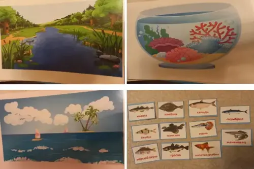 Большие картинки с изображением моря, реки, аквариума развешены на трех магнитных досках. Картинки с изображением морских, речных, аквариумных рыб. Дети делятся на три команды. Педагог показывает картинку, дети называют рыбку и магнитами прикрепляют на доску с изображением водоема.