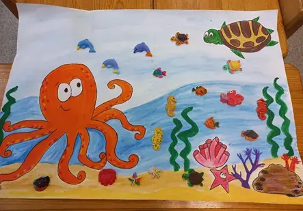 Раскрашивание рыбок и подводных обитателей. Дети вместе приклеивают их на ватман, с изображением морского дна.