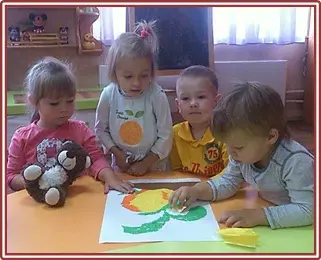 Воспитатель показывает и поясняет последовательность работы: «Сначала я беру полоски бумаги желтого и оранжевого цвета, разрываю на кусочки, затем смазываю одну сторону клеем и начинаю аккуратно приклеивать. Теперь вы, ребята!
