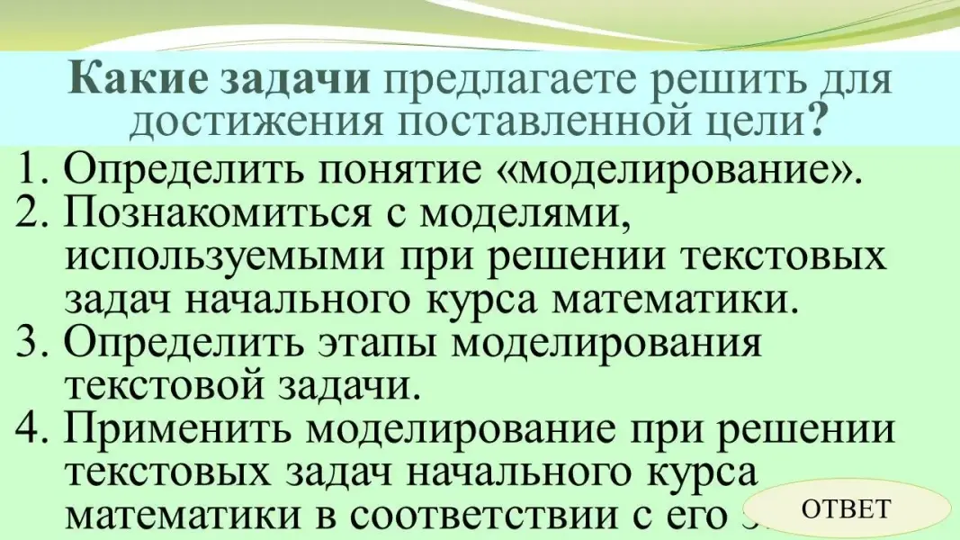 Итак, мы решили все задачи для достижения поставленной цели - изучение приема моделирования при решении текстовых задач начального курса математики.