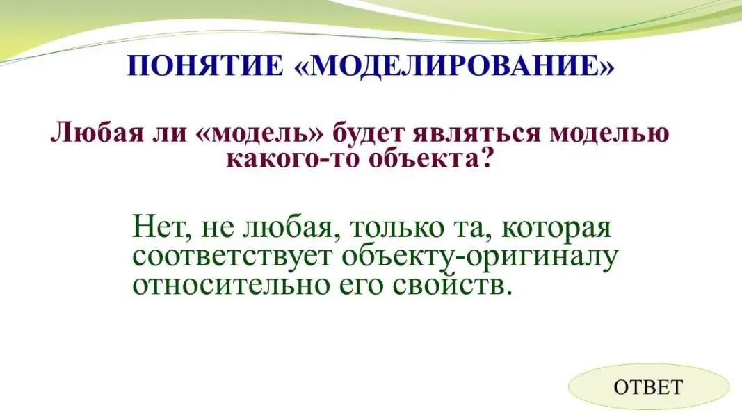 Моделирование позволяет изучать не интересующий нас объект, а его модель. |
