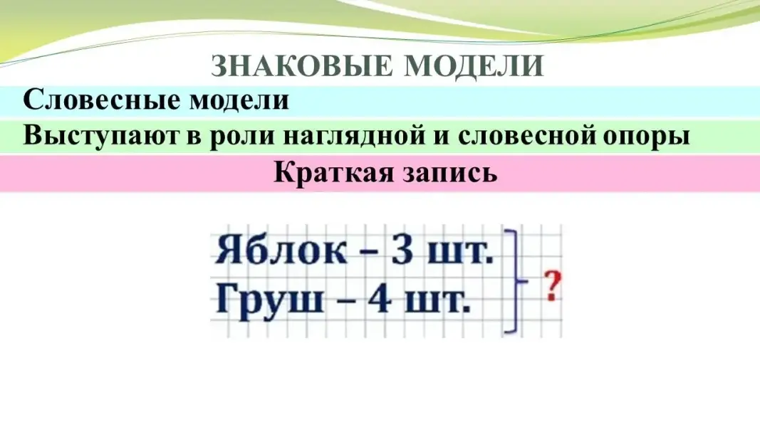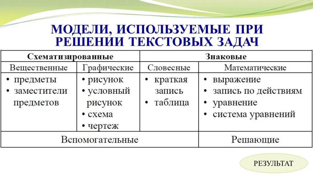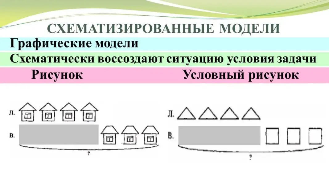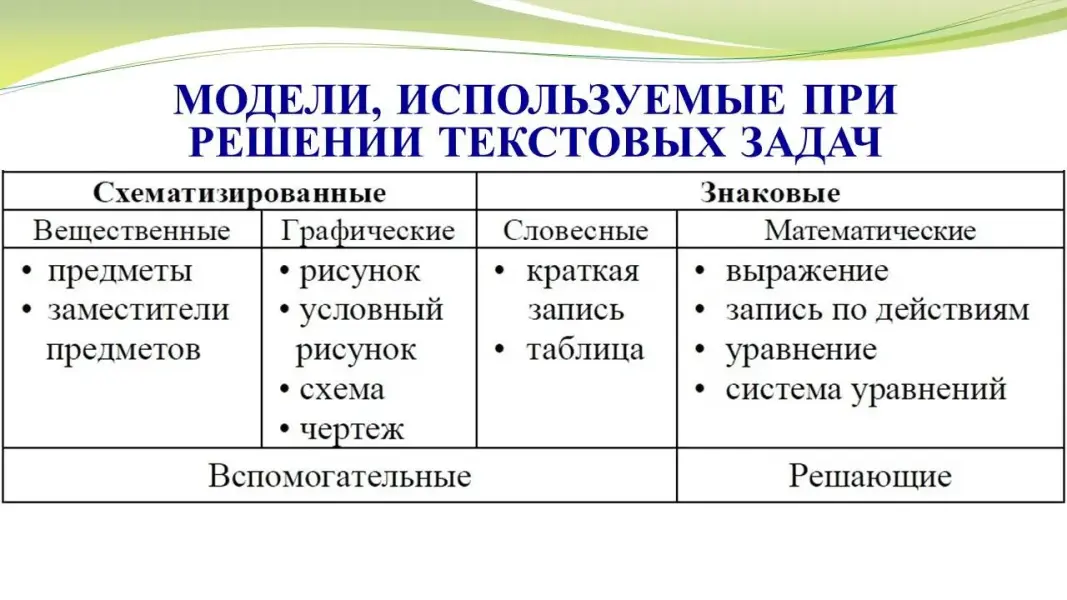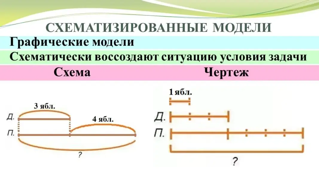 Любая из этих моделей призвана дать обучающимся возможность более полно увидеть отражение зависимостей между данными и искомыми в задаче, увидеть задачу в целом. |