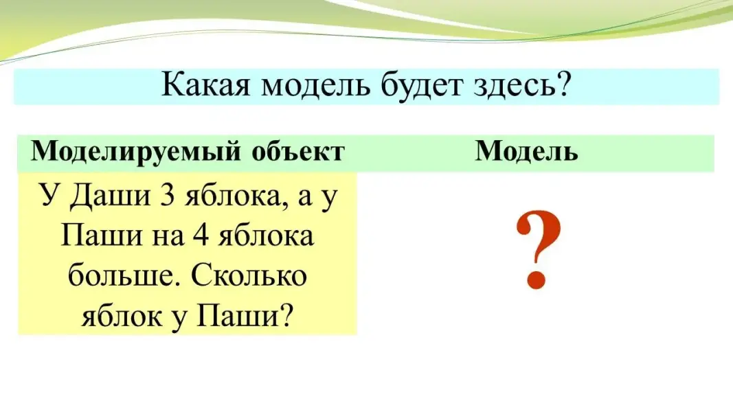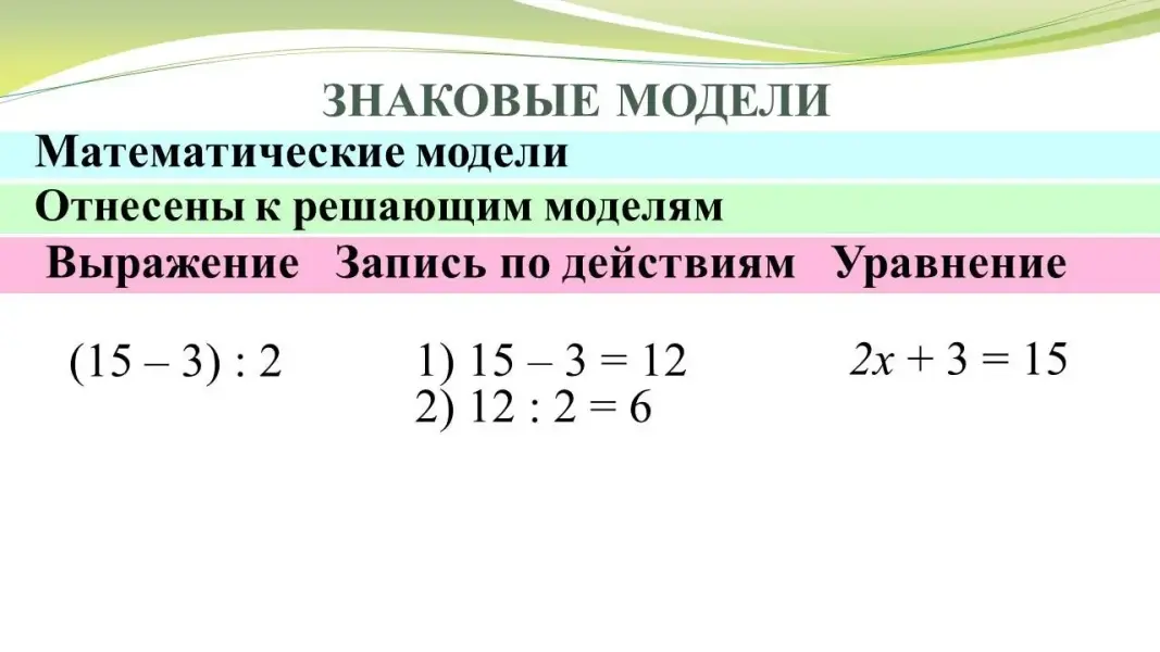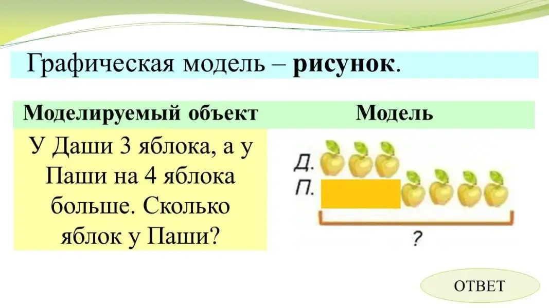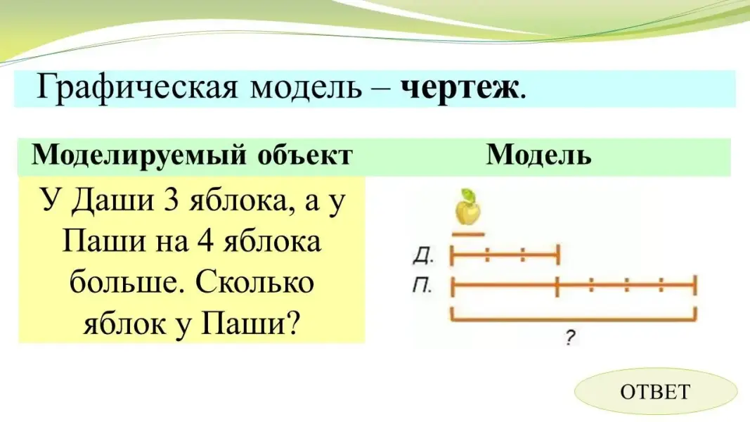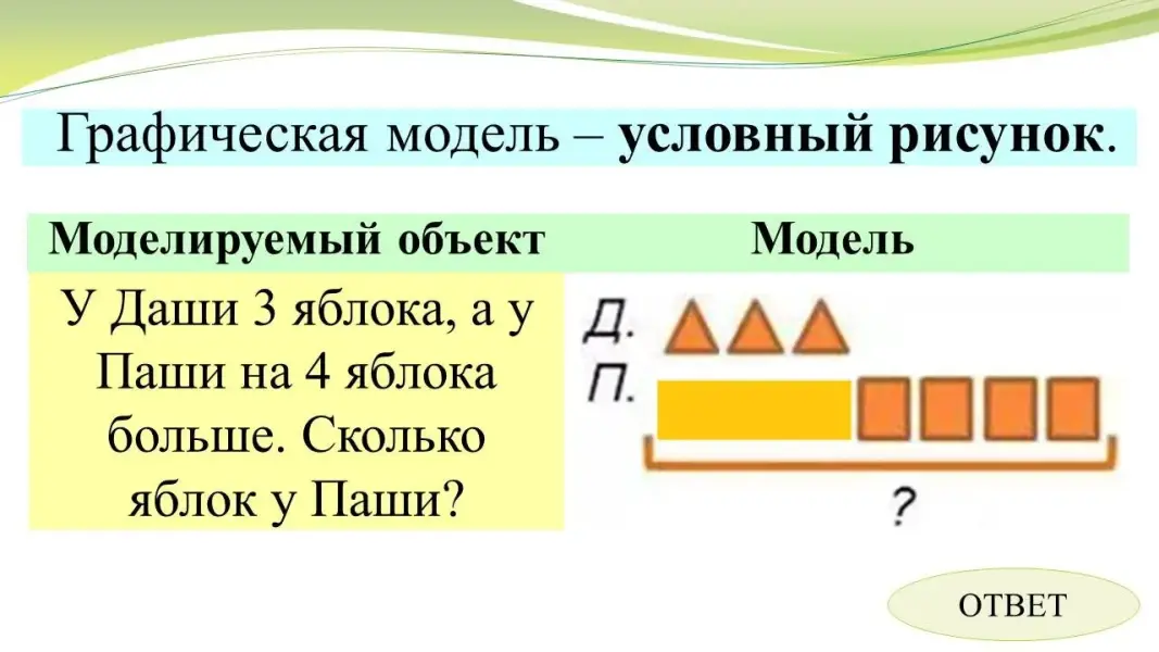Любая из этих моделей призвана дать обучающимся возможность более полно увидеть отражение зависимостей между данными и искомыми в задаче, увидеть задачу в целом. |