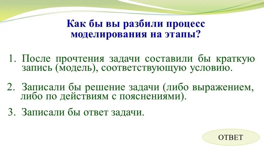 | Точное количество этапов моделирования текстовых задач, не определено, но моделируя решения задач начального курса математики, обычно выделяют три этапа: | ||