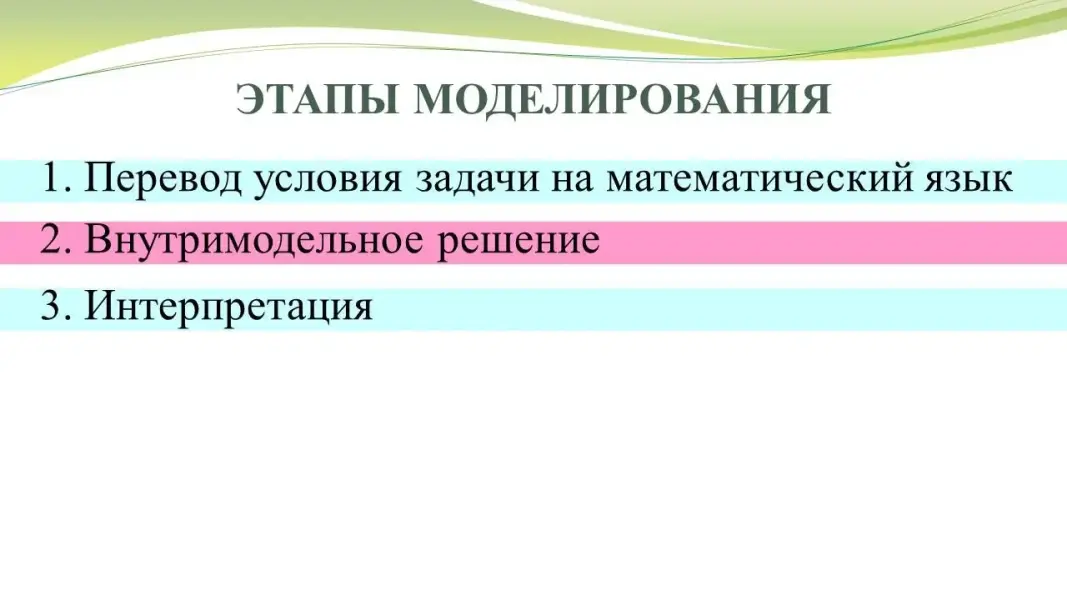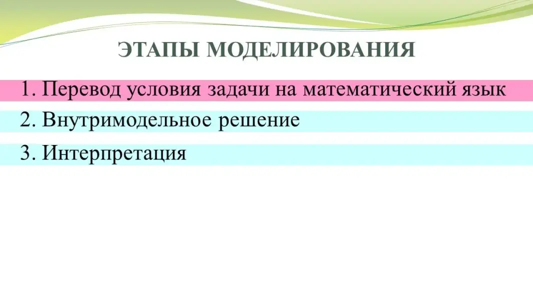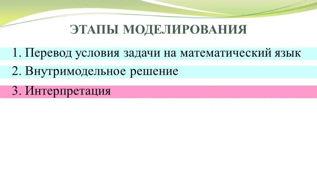 Перейдём к третьей задаче - определим этапы моделирования текстовой задачи |