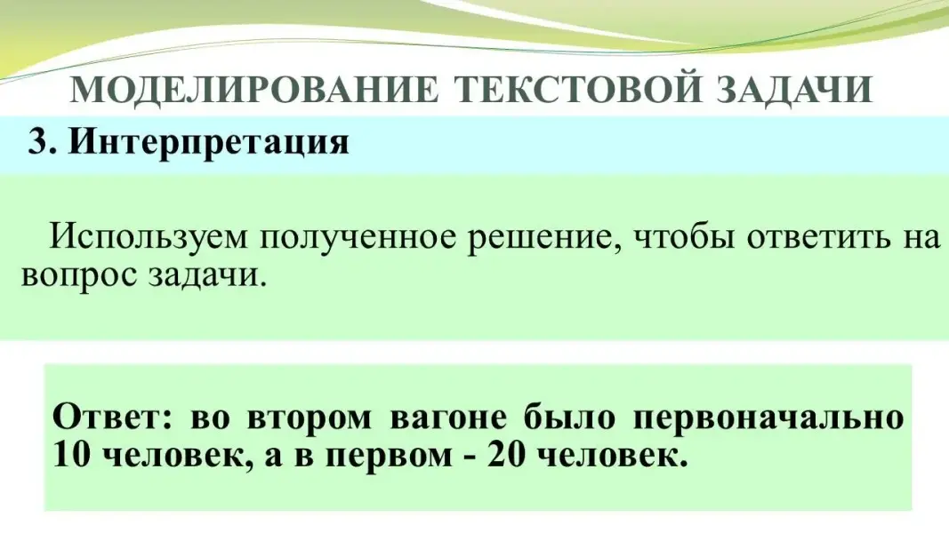 Запишем ответ: во втором вагоне было первоначально 10 человек, а в первом - 20 человек. |