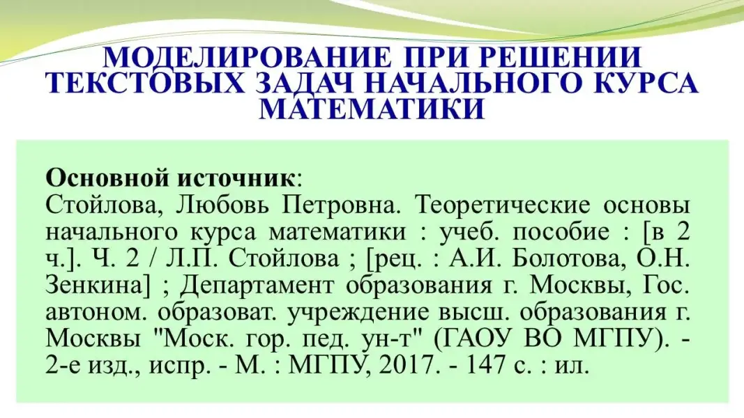 моделирование, текстовые задачи начального курса математики, начальная школа, СПО |